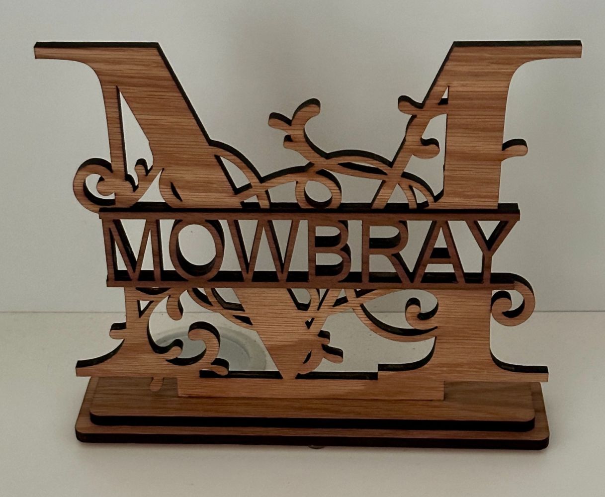 This is from our personalized monogram name collection. We can make these with any letter of the alphabet and name... if the name is not too long. This is a standup model with contrasting wood over the name to give a nice effect. These are laser cut from 1/4“ plywood veneer. Our recommended wood combination is walnut/maple or walnut/white oak. These make a great house warming gift, weeding gift... or just a gift for someone that has everything.